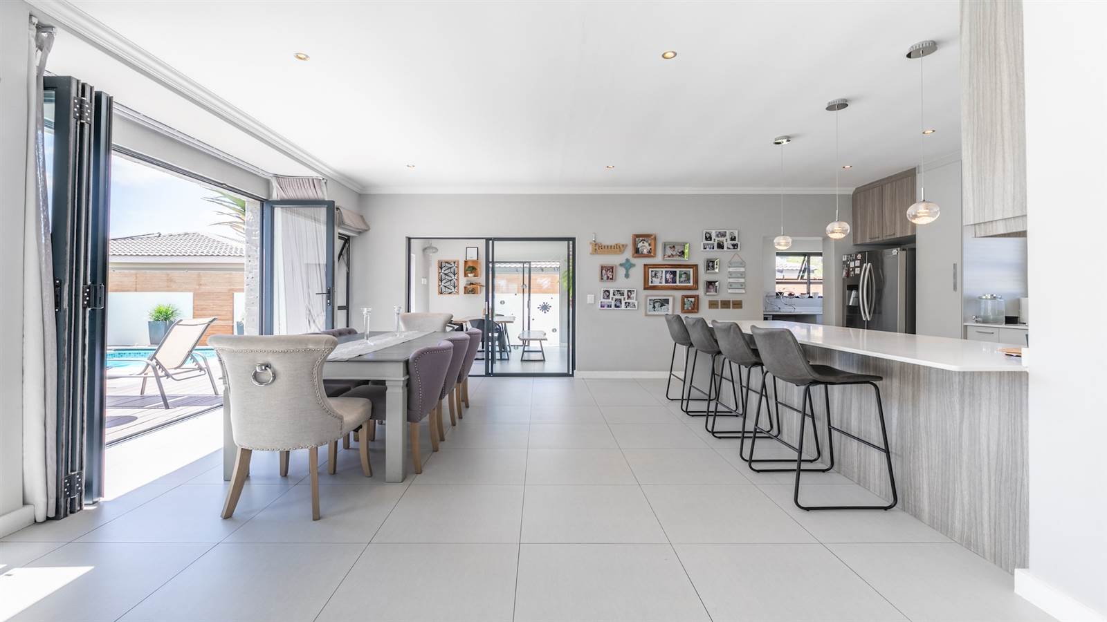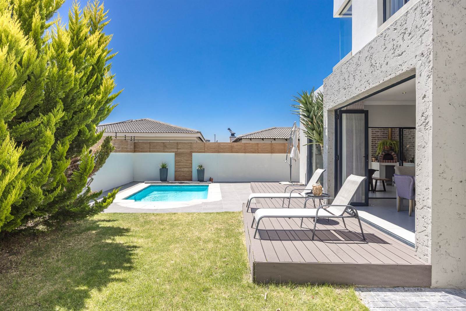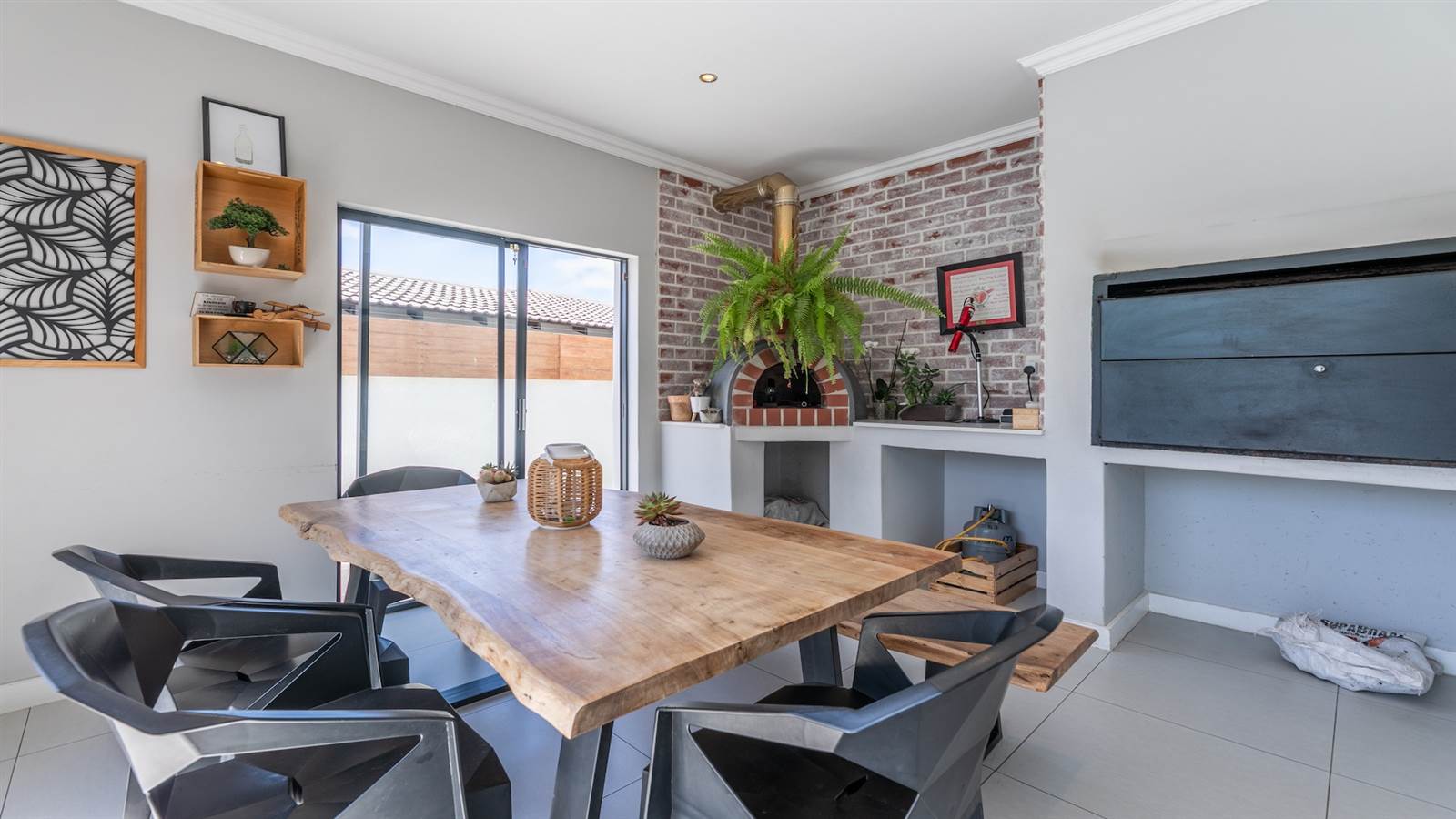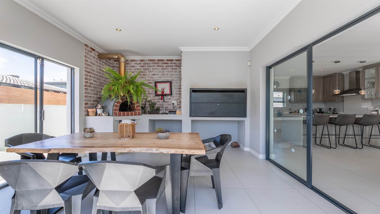 The expansive open-plan living spaces seamlessly merge with the outdoor entertainment area and sparkling pool, creating a captivating setting for hosting guests. A separate and enclosed braai room, complete with a state-of-the-art pizza oven, caters to the desires of even the most discerning barbecue connoisseur, setting the stage for delightful home gatherings with loved ones.