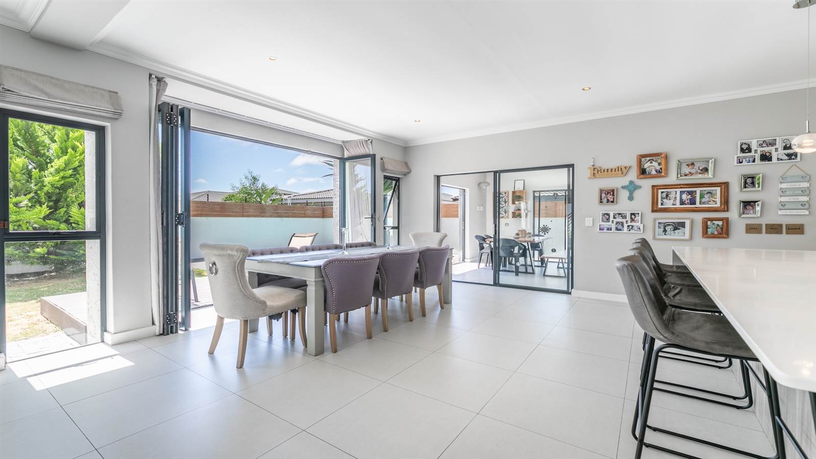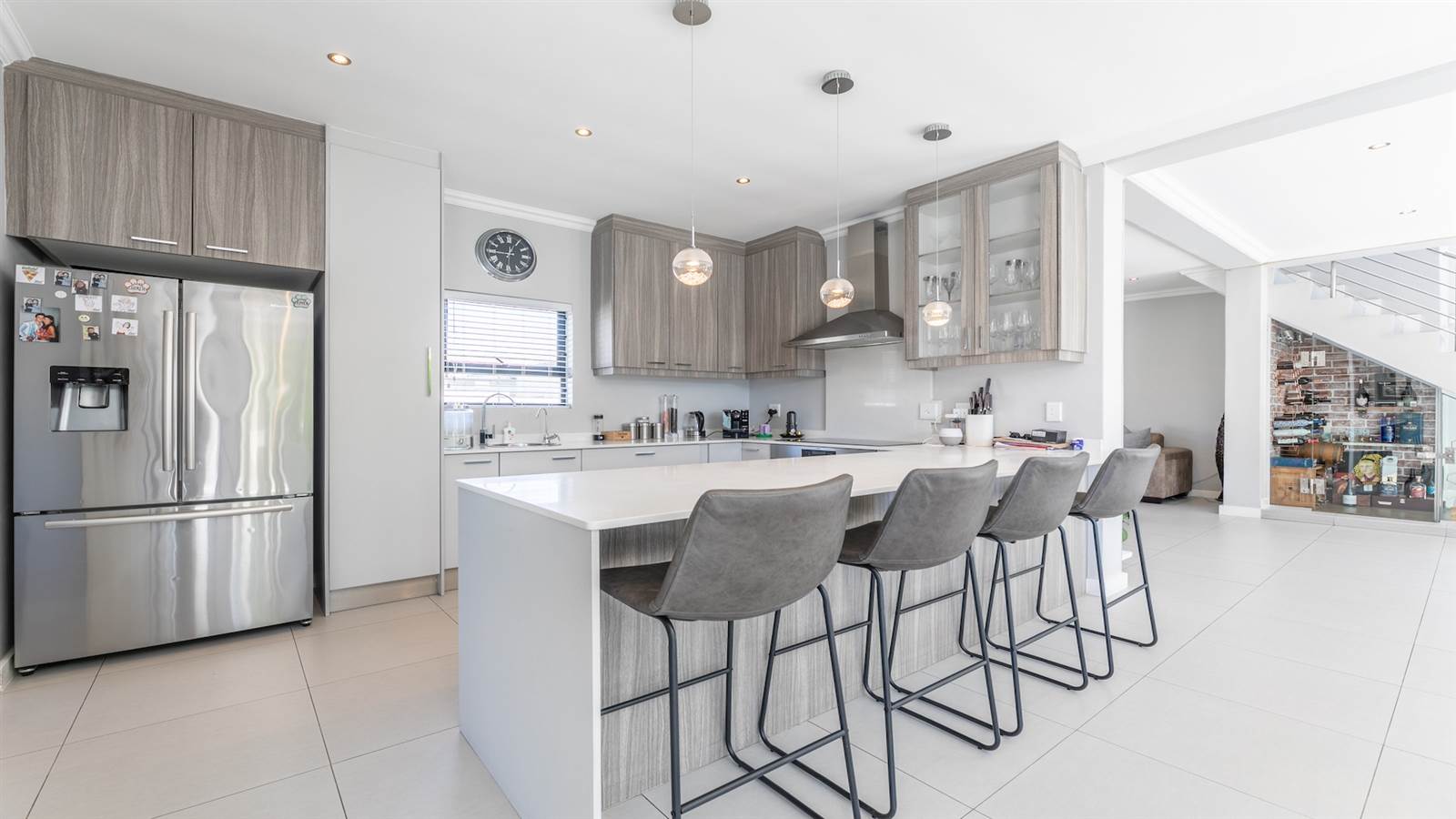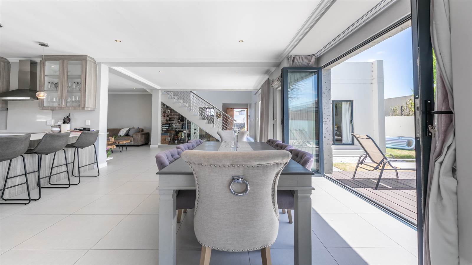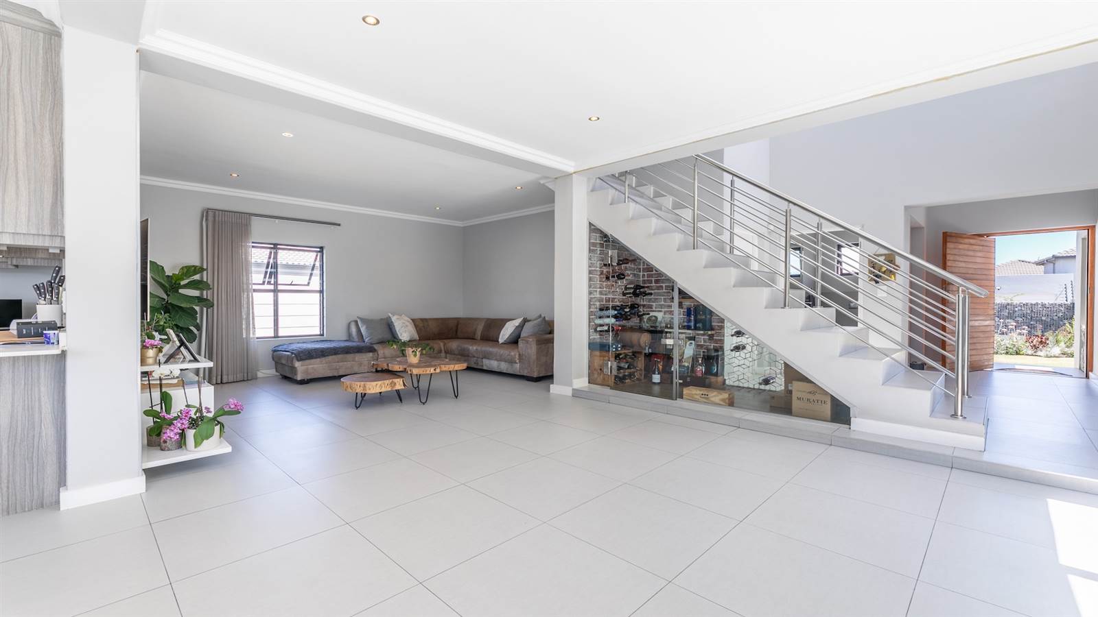 The expansive open-plan living spaces seamlessly merge with the outdoor entertainment area and sparkling pool, creating a captivating setting for hosting guests. A separate and enclosed braai room, complete with a state-of-the-art pizza oven, caters to the desires of even the most discerning barbecue connoisseur, setting the stage for delightful home gatherings with loved ones.